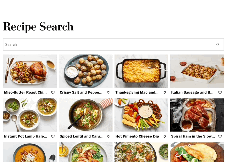 The RecipeCard contains an image, title, and favorite toggle button. It uses css grid and the UI Kit spacing constants to arrange these elements. With both the card as well as the favorites toggle being clickable it's necessary to include an invisible button as a sibling for both elements to remain interactive and accessible. Finally, a local storage hook is used to store any clicked favorites and persist them between visits.
