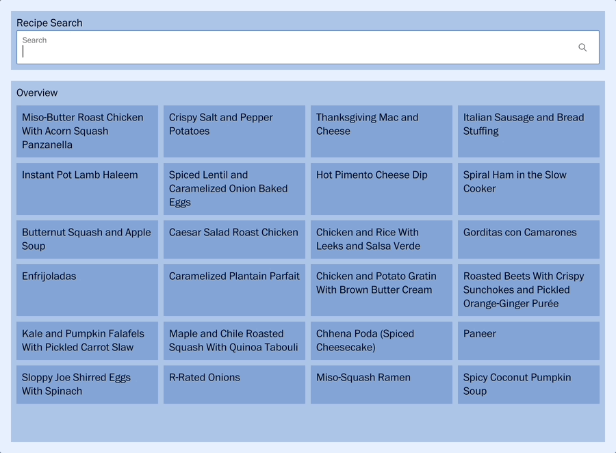 By default, Container is set to display flex with a direction of column. Our layout adds two children. A Header component contains elements that span the width of the page and an OverviewDetail component contains the grid of recipe photos and the selected recipe's details. StyledContainer un-sets alignItems to allow its child elements to have a 100% width. It also sets a flex property of 1 on OverviewDetail using an nth-child selector to allow it to expand and fill any vertical space not occupied by the Header. Using a child selector keeps OverviewDetail separated from the concern of how it is layed out in its parent.
